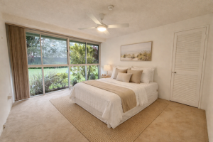 This immaculately presented unfurnished two-bedroom, two-bathroom apartment features ceiling fans and peaceful outlooks from the bedrooms toward the private building garden.